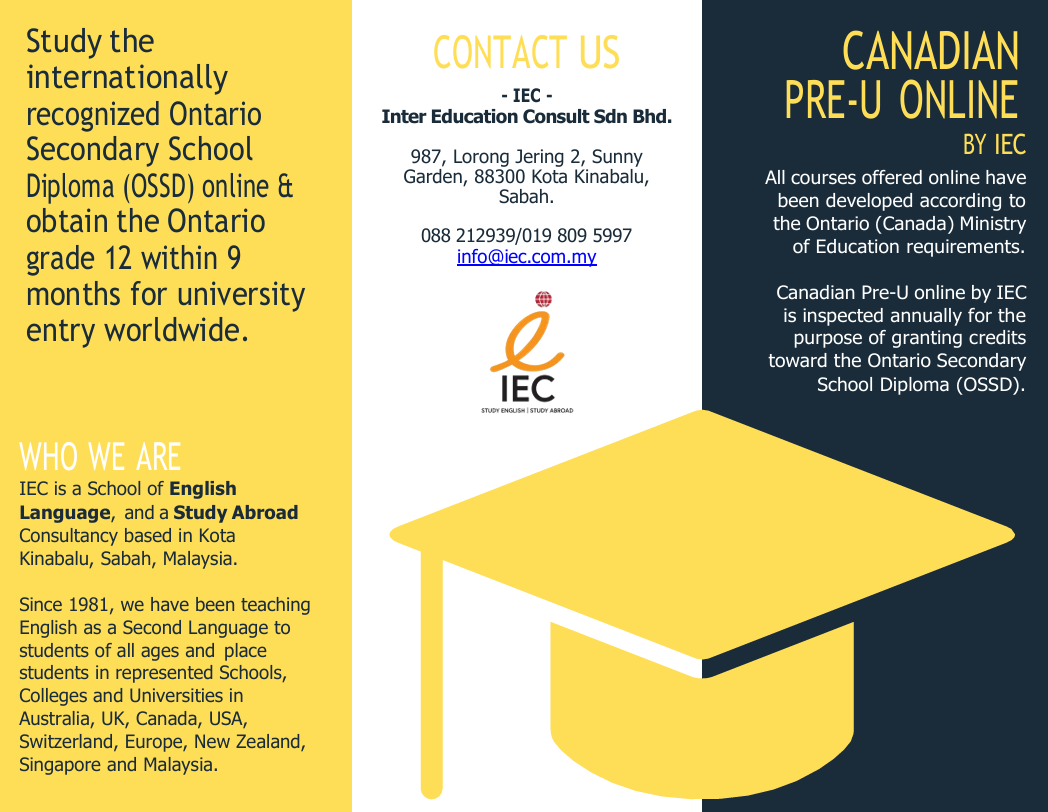 Study the internationally recognised Ontario Secondary School Diploma (OSSD) online from the comfort of your own home with IEC and obtain a completed Ontario Grade 12 within 9 months for University entry worldwide.